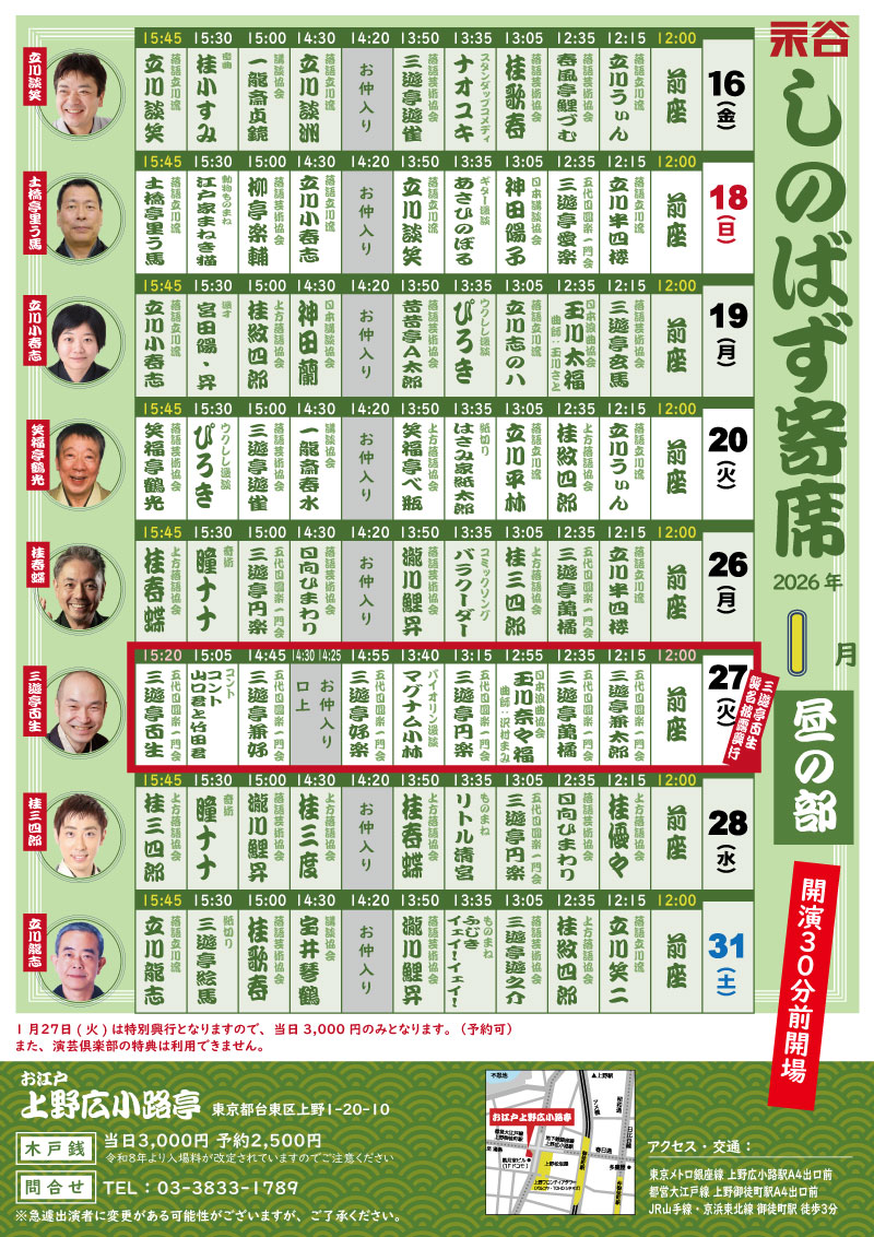 01月18日(日) 12:00 【しのばず寄席・昼の部】 [会場]東京・お江戸上野広小路亭 [木戸銭]予2500円/当3000円