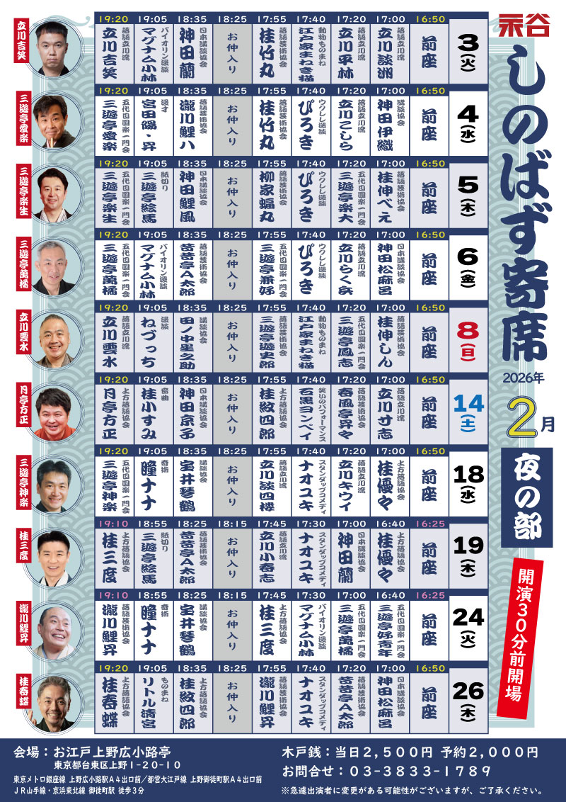 02月19日(木) 16:25 【しのばず寄席(夜)】vol. [会場]東京・お江戸上野広小路亭 [木戸銭]予2000円/当2500円