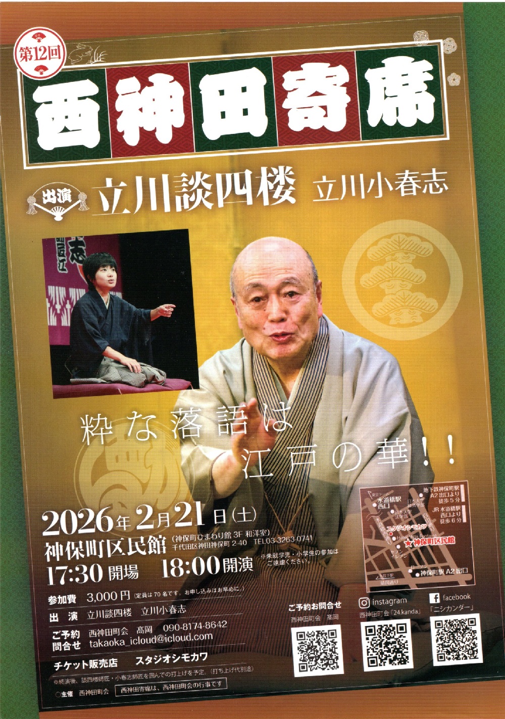 02月21日(土) 18:00 【第11回西神田寄席】 [会場]東京・神保町区民館 [木戸銭]3000円0000